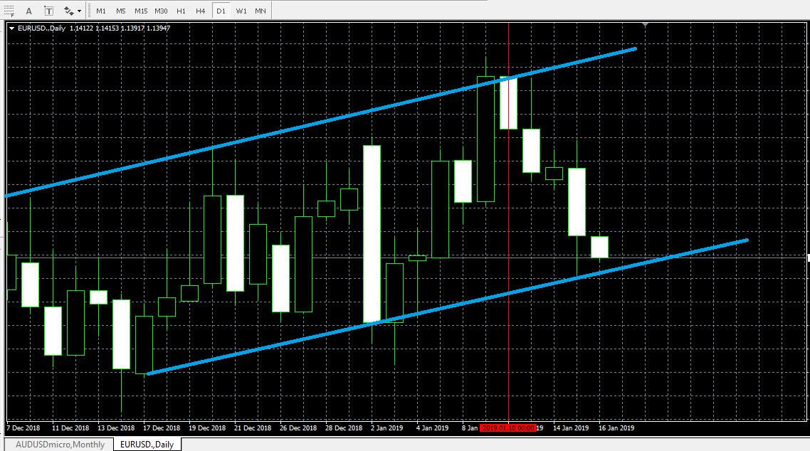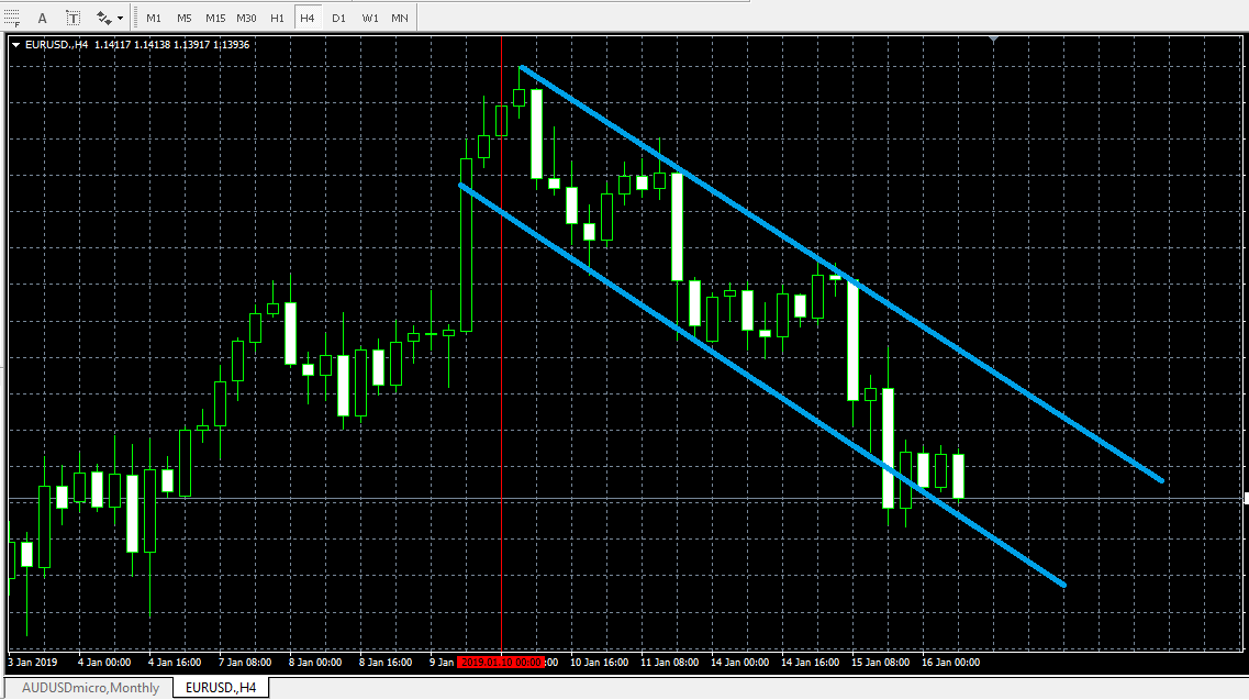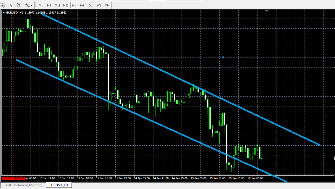 เส้นสีแดง แสดงวันที่ 10 เดือน มกราคม 2019 ซึ่งเป็นวันที่กราฟเริ่มลงวันแรก หลังจากนั้นกราฟ EURUSD ก็ลงมาตลอด เป็นระยะเวลา 5 วัน นี่เป็นกราฟ Daily และเส้นสีฟ้า เป็นเทรนด์ในกราฟ Daily ตั้งแต่เส้นสีแดงจนถึงแท่งเทียนสุดท้ายนั้นเป็นแค่การสวิงของกราฟ Daily ใน Time Frame Day แต่ใน Time Frame 4 ชั่วโมงลักษณะของกราฟนั้นจะแตกต่างออกไป และกราฟใน Time Frame 1 ชั่วโมงก็มีลักษณะแตกต่างออกไป เมื่อแท่ง Daily เท่ากับ 1 วัน จึงเท่ากับ 6 แท่งของ Time Frame 4H และเท่ากับ 120 แท่งของกราฟ Time Frame 1H ดังรูปต่อไปนี้