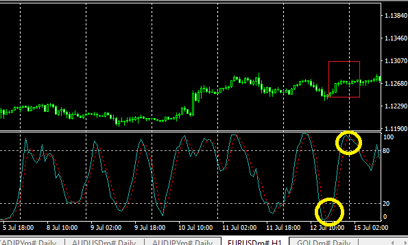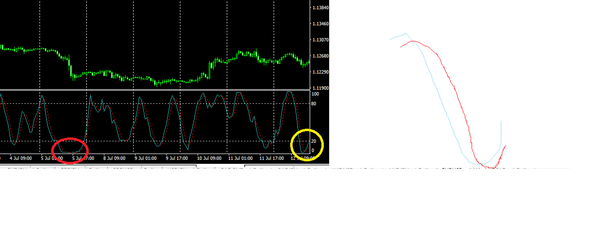 ผมได้ทำการปิดกราฟไว้ครึ่งหนึ่งแล้วผมจะอธิบายว่าผมรู้สึกอย่างไร ผมใช้ indicator Stochastic ในการเทรด โดยก่อนเทรด เราจะเห็นว่ารูปแบบของ Stochastic มี 2 แบบ คือแบบที่เราปรารถนามันจะลงมาและกลับขึ้นไปซึ่งเกิดในช่วงกราฟ Sideway เท่านั้น ถ้าหากกราฟขาลงยาว  Stochastic มันจะเป็นแบบวงกลมสีแดง คือราบและติดกับพื้น ไม่สามารถหลุดเส้น overbought ขึ้นมาได้ ในวงกลมสีเหลืองจะเห็นว่า มันไม่ได้มีรูปร่างเหมือนกัน