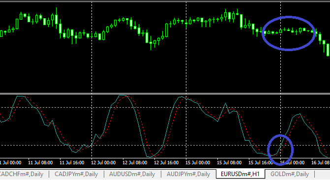 ในภาพจะเห็นว่าผมไม่ส่งคำสั่งเทรด และปรากฏว่ากราฟ Stochastic มันขึ้นแต่ราคามันไม่ขึ้น อย่างที่ผมบอก ซึ่งต่อมาท่านจะเห็นว่า มันหลุดลงต่ำกว่า Low ตอนตัดกันทำให้ผมไม่เทรด ในวงกลม และหลังจากนั้นราคารูดลงยาว แสดงว่าวิธีคิดของเราก่อนการเทรดนั้นได้ผล  ทำให้เราได้ทำการวิเคราะห์การเทรดอย่างเหมาะสมสำหรับใช้ในสถานการณ์ต่อไป