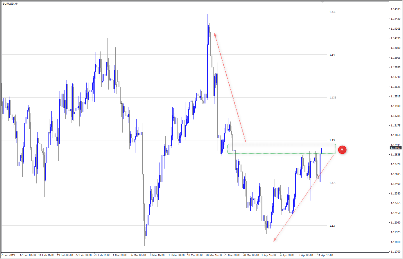 หลักการทั่วๆ ไปในการวิเคราะห์ price chart เปล่า เริ่มด้วยการมองที่ราคาปัจจุบันที่ A แล้วมองเป็นพื้นที่ เช่นอย่างที่ตีกรอบสีเขียวแล้วเราก็มองย้อนกลับมาทางช้ายมือ จนถึงจุดที่ราคาวิ่งผ่านแล้วก็มองขึ้นเพื่อหาว่าตอนราคาลงมาราคาโต้ตอบตรงไหนและอย่างไร เพื่อหาว่าจะเป็นแนวต้านหรือ resistance zone/supply zone และมองลงไปด้านล่างเพื่อดูว่าราคาโต้ตอบตอนไหนและอย่างไร เพื่อดูว่ามีแนวรับหรือ support zone/demand zone หรือเปล่า