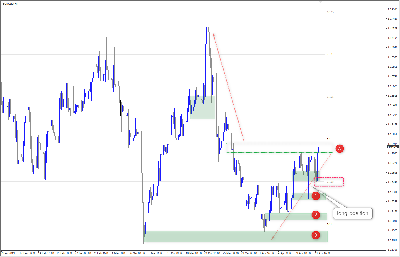 มองดูสถานการณ์ปัจจุบัน ตอนนี้ราคาดันมาเกิน short positions เป็นไปได้ว่า ราคาจะวิ่งไปต่อเพราะขาใหญ่พวกที่เก็งกำไรระยะสั้นเป็น short-term speculators อาจจะดันราคามาแตะ stop loss พวกนี้ แล้วมาปิดแถวๆ ก่อนถึง 1.135  ที่อาจจะมี sell limit orders ตรงนั้นแล้วดันราคาลงมาก่อน แต่ถ้าราคาดันเกินขึ้นไป อาจมีการล่า stop  ที่อิง supply 1 แล้วไปหยุดที่เลข 2 ให้กลายเป็นจุดที่น่าจะเปิด sell  ดังนั้นเมื่อจะเข้าเทรดอีกต้องดูว่าราคาโต้ตอบพื้นที่กรอบแดงด้านบน 2 กรอบอย่างไรประกอบกัน