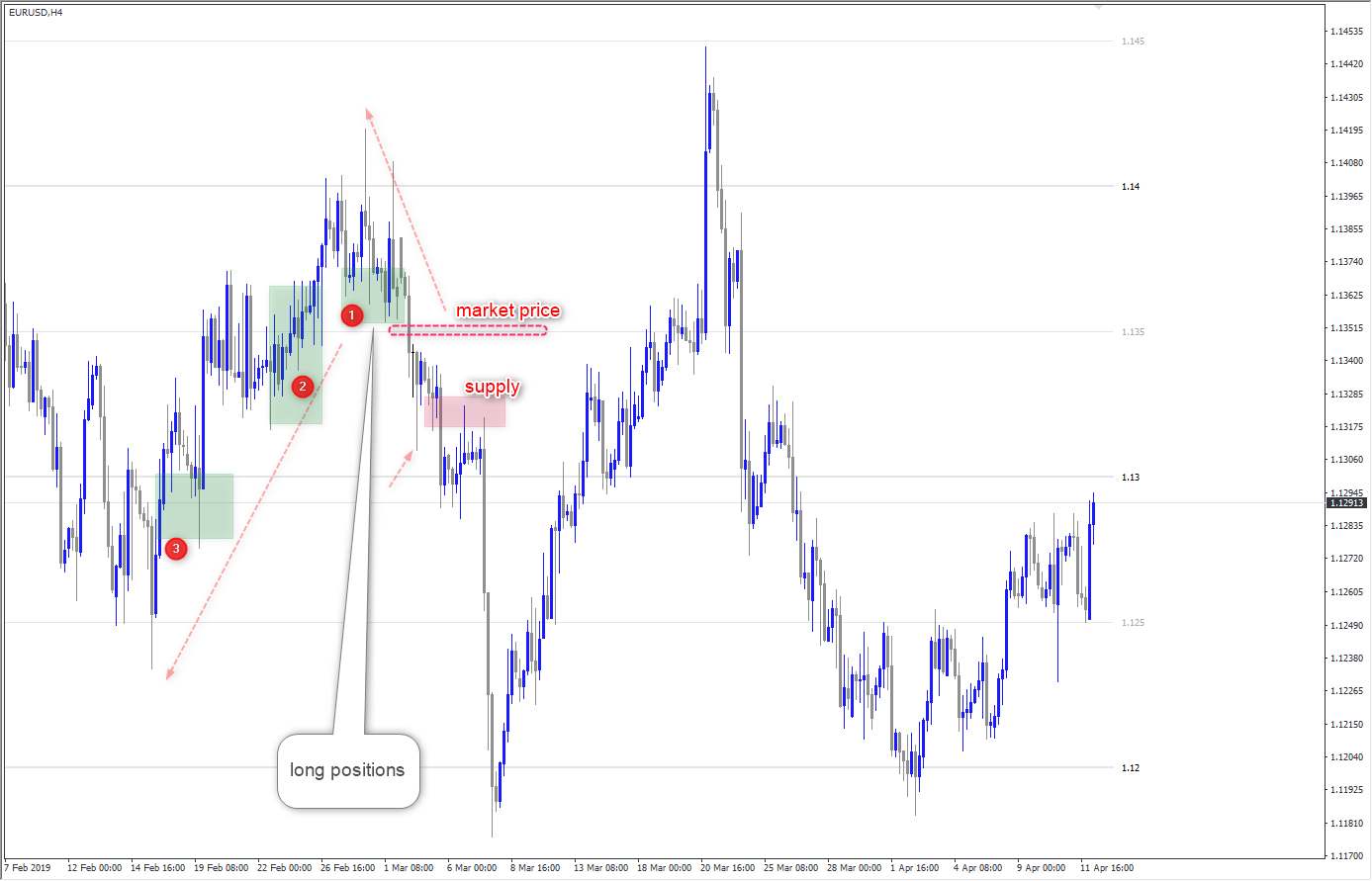 สมมุติ ราคาตลาดอยู่ตรงกรอบสีแดง จะเห็นว่าราคาเบรคพื้นที่ long positions ลงมาได้เป็นครั้งแรก เทรดเดอร์ที่เปิด long positions พวกนี้กลายเป็น trapped traders และหลังจากราคา consolidation ก็จะมี breakout traders ด้วยที่ตั้ง sell stop ที่ต่ำกว่าพื้นที่ long positions  หลักการสำหรับเทรดอย่างหนึ่งที่ต้องมองให้ออกว่าทางที่เราเทรดไปหรือทางที่ราคาจะวิ่งไปราคาวิ่งไปได้ง่ายหรือเปล่าหรือที่เรียกว่า path of least resistance ในกรณีนี้ตัวต้านก็เป็นพื้นที่ demand 1 2 และ 3 จะเห็นว่าพื้นที่ demand เลข 2 ไม่มีอะไรบ้างบอกว่าเป็น demand ที่แข็งแถมราคายังได้ย่อตัวมาแล้วด้วย (ดูหางบาร์ด้านล่างในกรอบ) แต่กลายเป็นว่าซึมชับแบบนี้ไม่ได้หมายความว่าราคาจะวิ่งไปทันที ดูจนกว่าบาร์ที่แทงหางลงมาเกิดพื้นที่ demand 2 เกิดขึ้นจึงสร้างความกดดันให้พวก trapped traders ที่เปิด long positions ที่ demand เลข 1 และ 2 ที่ต้องทำอะไรบางอย่างเพราะข้อมูลเปลี่ยนไปจาก price structure ที่เกิดขึ้น จะเห็นว่าบาร์หลังบาร์บาร์ที่แทงลงไปเปลี่ยนข้อมูลพอราคาเด้งกลับมาอยู่แถวพี้นที่เดียวกันหมดเพราะ trapped traders จากเลข 1 และ 2 เริ่มออกจากตลาด สังเกตดูพอราคาโต้ตอบที่ supply แต่เป็นการโต้ตอบจาก demand ที่เลข 3 ราคาสามารถอยู่ในพื้นที่ได้หลายบาร์และเด้งขึ้นไปเกินนิดหน่อยแถมโดน seller ตรงที่ supply กดลงมาตลอดด้วย เมื่อเปิด shorp positons ที่พื้นที่ supply ถ้าโครงสร้างไม่เปลี่ยน มีแค่เวลาและความอดทนที่ต้องผ่านให้ได้ สุดท้ายราคาก็ลงแบบแรงไปด้านล่าง