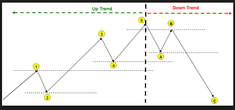 หลักการคร่าวๆของ Elliot Wave กล่าวว่า วงจรของตลาดจะเกิดขึ้นซ้ำๆกัน อันเนื่องมาจาก อารมณ์ของนักลงทุนในตลาด ซึ่ง พฤติกรรมเหล่านี้ ได้ส่งผลออกมาในรูปแบบของกราฟ ในรูปแบบเดิมๆ ซ้ำๆ อยู่เสมอดังจะเห็นได้จากกราฟ มี Pattern ต่างๆ ซ้ำๆ กัน เขาเรียก มันว่าการ สวิงขึ้น ลงของราคา โดยใน ขาขึ้น นั้นเรียกว่า “Impulse” และ ในทิศทางขาลงเรียกว่า “Correction” และ ดังนั้นเราจึงใช้ ทฤษฎีนี้ มาทำนายทิศทางของกราฟ ได้