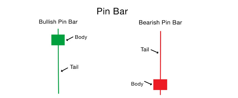 - แท่งเทียน Pin Bar มาจาก Pin ที่แปลว่า เข็ม สาเหตุเพราะ แท่งเทียนมีลักษณะคล้ายกับเข็ม แท่งเทียน Pin Bar จะเรียกอีกชื่อว่า Hammer หรือ ค้อนก็ได้ (แล้วแต่จะเรียกเลยครับ) ลักษณะสำคัญของแท่งเทียน Pin Bar คือ มีหางที่ยาว และมี body ที่เล็ก ขอเน้นย้ำครับว่า หางต้องยาว!! Body ต้องเล็ก ถามว่า หางต้องยาวขนาดไหน ผมแนะนำว่า ยาวอย่างน้อย 3 เท่า ของ Body ครับ แต่ถ้าตัวแท่ง Nose (หางเล็ก ๆ ที่ตรงกันข้ามกับ หางยาว ๆ) ตัว Nose ต้องสั้น ๆ ครับ ถึงจะดี เพราะ แสดงถึงสัญญาณที่แรง (ดูรูปด้านล่างประกอบครับ)