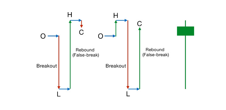 - จะเห็นว่า การเกิดแท่งเทียน Pin Bar จะเกิดได้ 2 แบบ ตามรูปครับ โดยทั้ง 2 แบบ ราคาเปิด (Open) กับ ราคาปิด (Closed) จะอยู่จุดเดียวกัน ต่างกันที่ระหว่างวันจะวิ่งลงก่อนหรือวิ่งขึ้นก่อนเท่านั้น