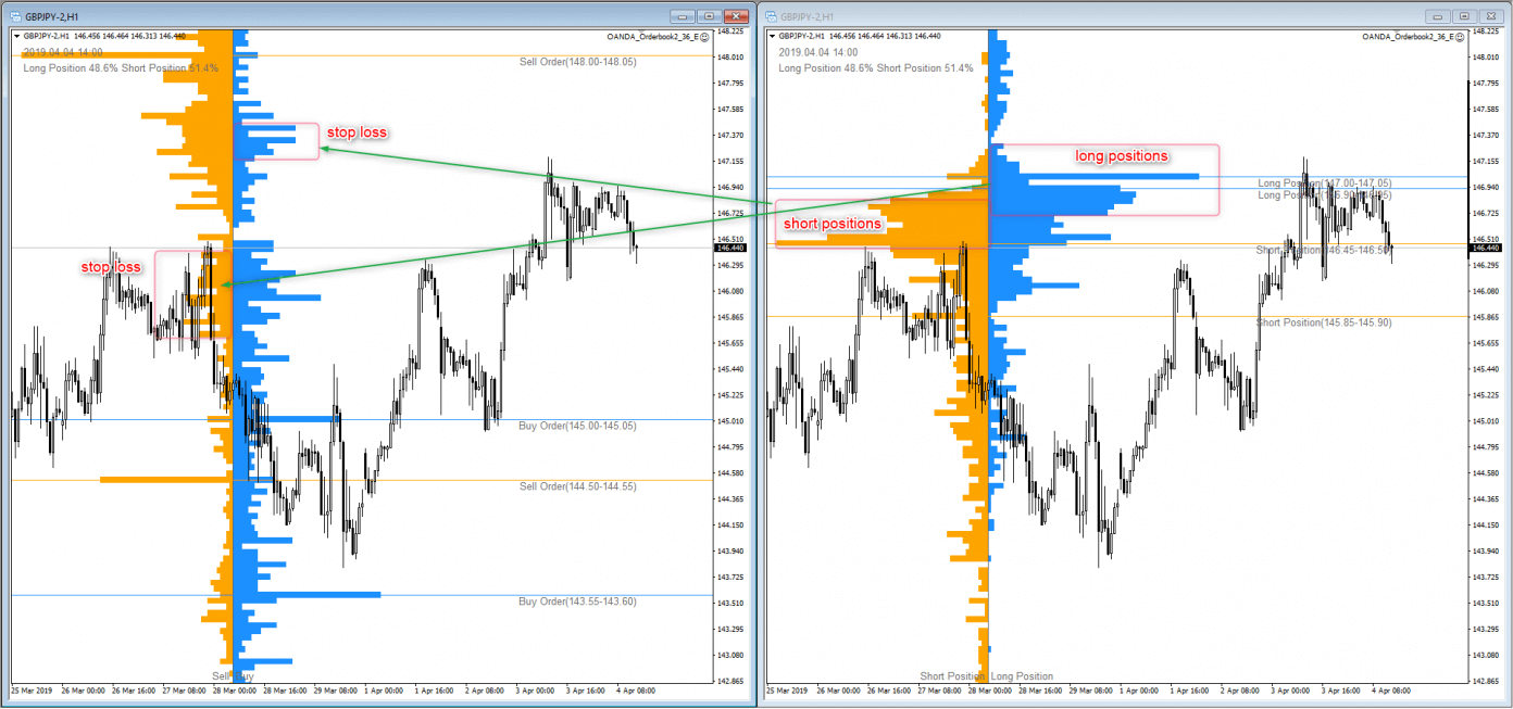 มาดูข้อเสียของการกำหนด stop loss ลงไปที่ server หรือกับออเดอร์ที่เปิดเทรดไป นี่เป็นตัวอย่างจาก Oanda OrderBook ที่แสดงข้อมูล open orders (ที่เป็น limit orders และ stop orders) และ open positons (ที่เป็นทั้งเปิด short และ long positions ในตลาดยังไม่ได้ปิดมีกำไรและติดลบ) ของลูกค้า Onada ที่กำลังเปิดอยู่ ที่ยกมาเป็นแค่โฟกัสส่วน Open Orders ด้านล่างช้ายก็จะเป็น stop orders ที่มาจาก stop loss ของเทรดเดอร์ที่กำลังเปิด long positons แต่ติดลบตอนนี้ตั้ง stop loss ไว้และ stop orders ด้านบนจะเป็น stop loss ของพวกที่เปิด short positions แถวนั้นหรือต่ำกว่านั้นลงไปอีก ดังนั้นจึงบอกว่าเป็นข้อเสียของการตั้ง stop loss เพราะมันจะถูกเปิดเผยว่าท่านตั้งที่ไหน จะทำให้ขาใหญ่เห็นแล้วใช้ประโยชน์ได้