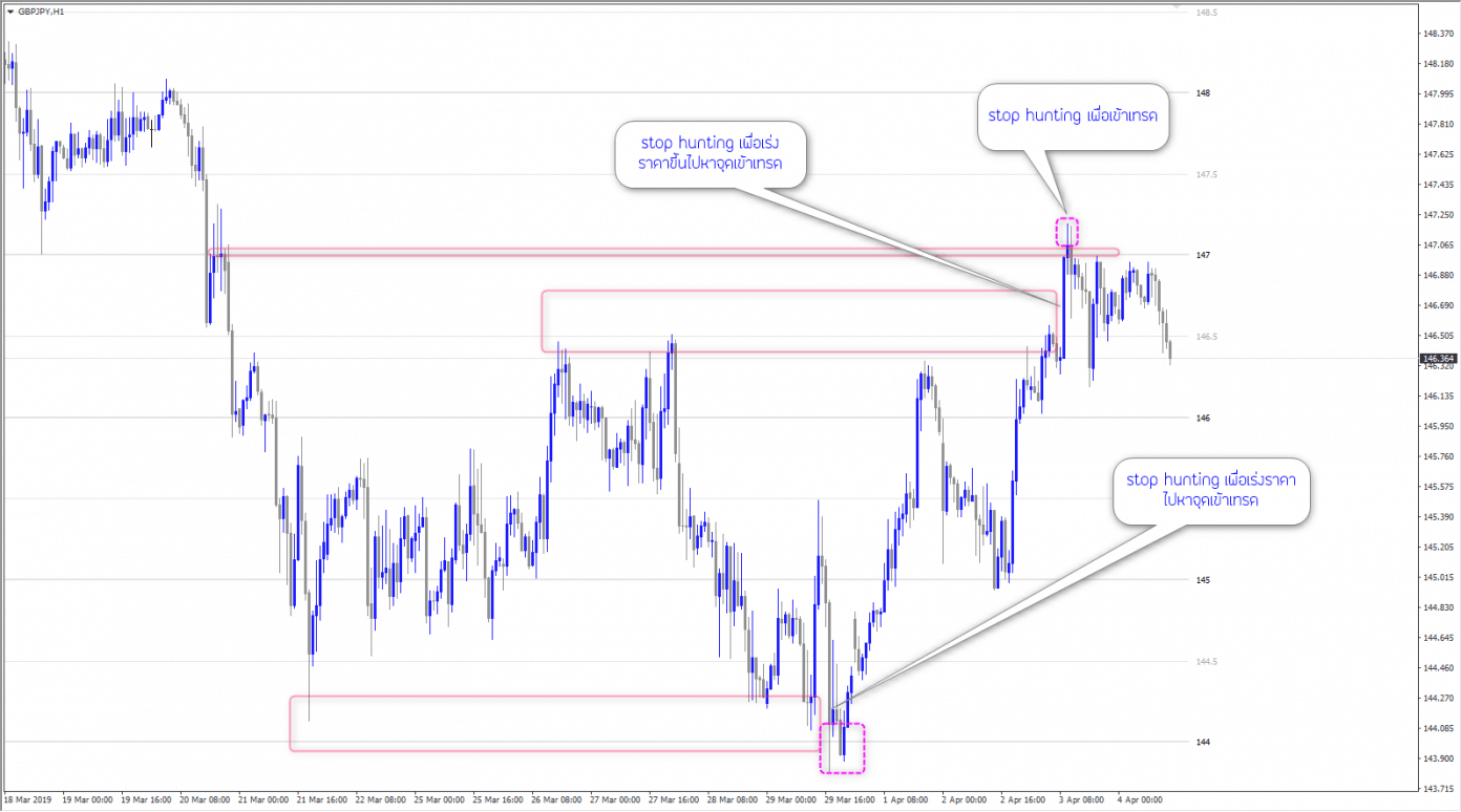 ขาใหญ่หรือ market makers ใช้ประโยชน์ 2 อย่างกับ stop orders ที่พวกเขาเห็น อย่างแรกดันราคาให้ไปแตะให้ stop orders ทำงานแล้วราคาก็จะวิ่งไปหาออเดอร์ที่พวกเขาตั้ง limit orders ไว้เพื่อเข้าตลาดในทางตรงกันข้ามจะทำให้พวกเขาเข้าตลาดได้ราคาดีกว่าและมีออเดอร์ไปหา liquidity ที่พวกเขาตั้งไว้รอ ดังจะเห็นในรูปว่าเกิด false breakout หรือ stop hunting เป็นประจำ อย่างที่ 2 พวกเขาจะดันราคาให้แตะ stop orders เพื่อเร่งราคาไปทางที่พวกเขาเปิดเทรดไว้ก่อนเพื่อให้ราคาวิ่งไปเร็ว
