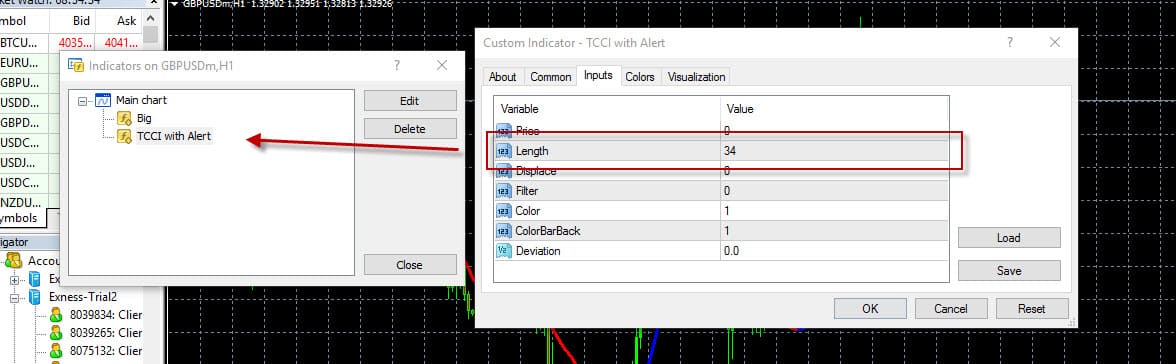 เปลี่ยนค่า Default ตรง Length => 34 ( ประมาณว่า EMA34 ) ซึ่งผมถนัดในค่าแบบนี้ครับ มาดูว่าใส่ลงในกราฟแล้ว เรามีโอกาส มาก น้อยแค่ไหน