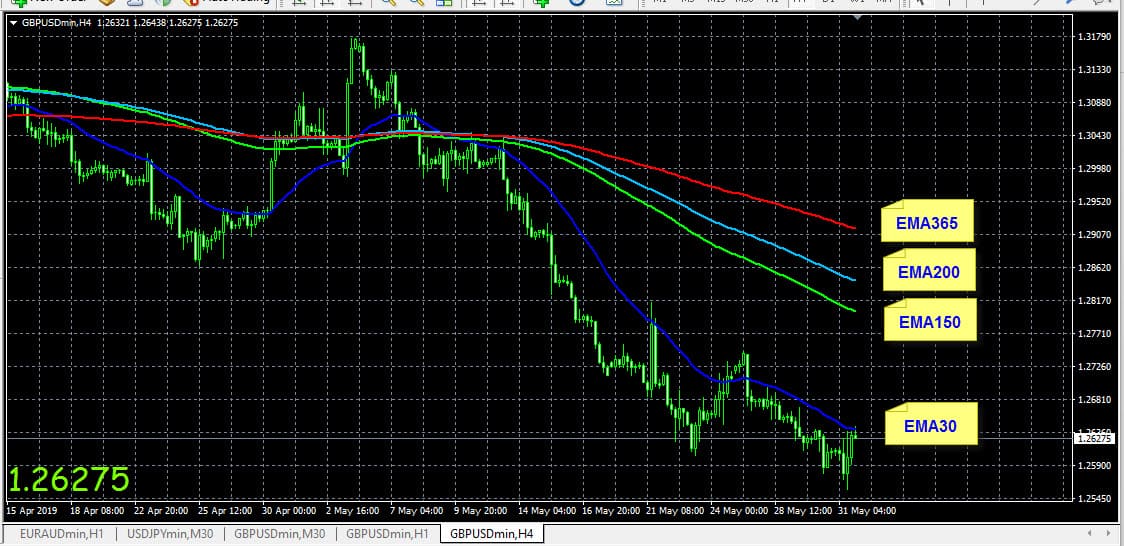 โดยระบบยึดเส้น EMA30 เป็นเทรนหลัก ส่วน EMA150 , 200 , 365 เป็นเส้นที่ สนับสนุน เทรนหลัก อย่างเส้น EMA30
