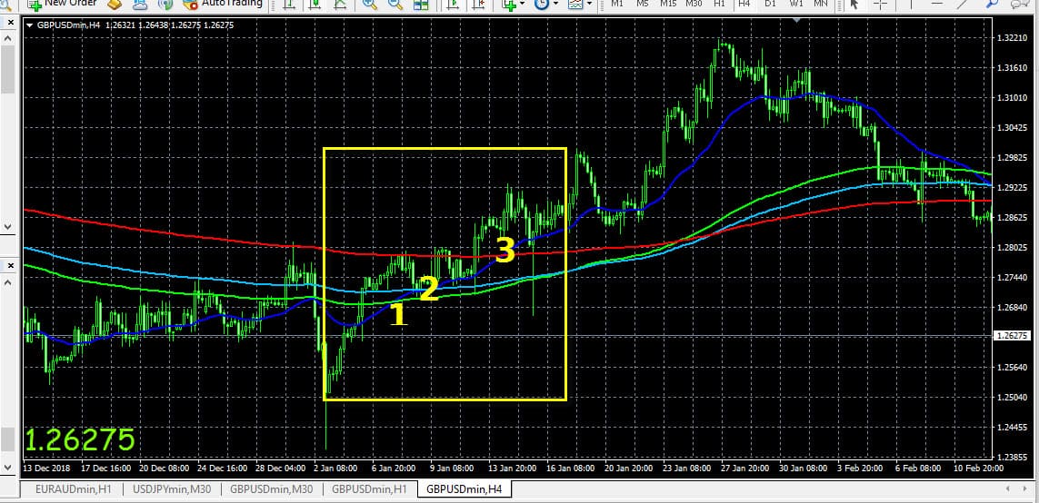 อันดับแรก ต้องใช้ กราฟ H4 ให้ตรงตามชื่อระบบ ใช้เส้น EMA 4 เส้น โดยตั้งค่าตามด้านล่าง