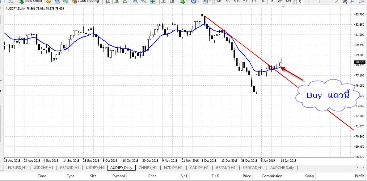 ในภาพ เราตีเส้นในขาลง บังเอิญว่า เส้น EMA 10 นั้น วิ่งเกือบจะคู่ขนานไปกับเส้นที่เราตีไว้ ถ้าเราเจอสภาพแบบนี้น่าจะรอให้กราฟมันทะลุเส้นที่เราลากไว้เพื่อให้แน่ใจว่ากราฟเปลี่ยนเทรนแล้วค่อยเข้า buy อย่างต่ำ ๆ ก็ หนึ่งวัน แน่นอนครับ การใช้ TF ใหญ่ซะขนาดนี้ ความแม่นยำ สูงครับ เปลี่ยนคู่มาเป็น AUD/JPY บ้าง ยังคงใช้กราฟ Day อยู่
