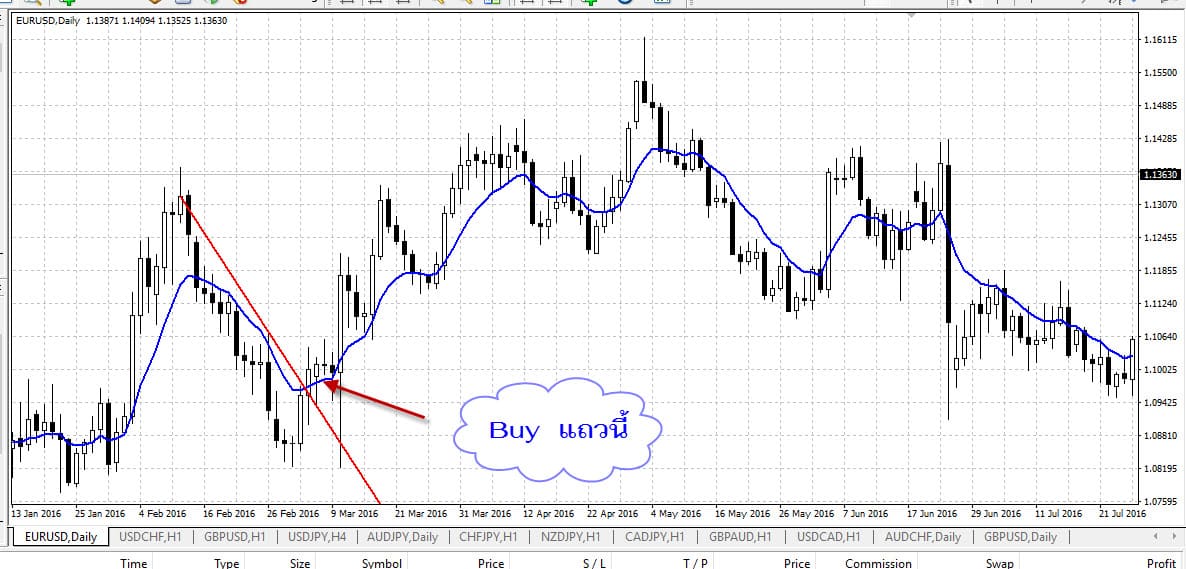 ใช้เครื่องมือร่วมวิเคราะห์คือเส้น EMA เพื่อ เปิดตามเทรน ส่วนเส้นใช้ EMA10 เนื่องจาก ระยะของเส้นกับ แท่งเทียน Day ไม่ห่างมาก ดูทิศทางของเทรนได้ ง่าย หลุดเทรนก็เห็นแทบจะทันทีในวันนั้น ส่วนคู่เงินนั้น แล้วแต่ใครจะถนัด