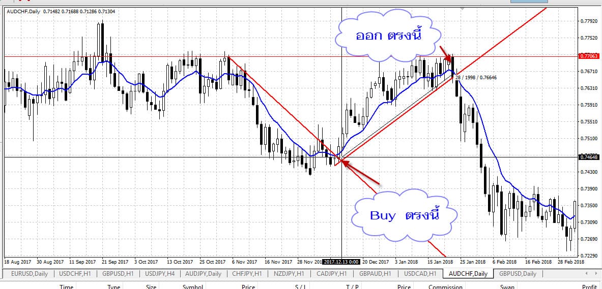 ทีนี้มาดูการตีเทรนไลน์ ด้วยกราฟ Day กันเลย โดยเพิ่ม เส้น EMA 10 เข้ามาช่วยด้วย มาดูคู่แรกกันก่อน คือคู่ AUD/CHF มาดูกัน