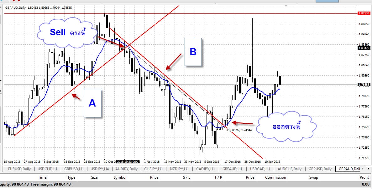GBP/AUD ถอยกราฟมาวันที่ 23-10-2018 เส้น A คือเส้น ขาขึ้น เรา มาเปิด Sell ที่ขาลงกัน คือ รอให้กราฟหลุดต่ำกว่าเส้น A แล้วเปิด ออร์เดอร์ Sell เลย รอบนี้ถือไว้ 39 แท่ง 39 วัน บวกมา 852.6 pipsถ้าเราใช้บัญชี STD แล้ว เปิด 0.01 lots ก็จะได้กำไร 85.28 $ กับเวลาที่ใช้ถือ 39 วัน มากกว่าคู่ AUD/CHF เกือบ 3 เท่าตัว รวม ๆ ก็เป็นที่น่าพอใจ สำคัญตรงที่ว่าพอเทรดจริง ๆ แล้ว จะทำได้แบบนี้ไหม ต้องฝึกกันเองนะครับ พบกันใหม่ตอนต่อไป