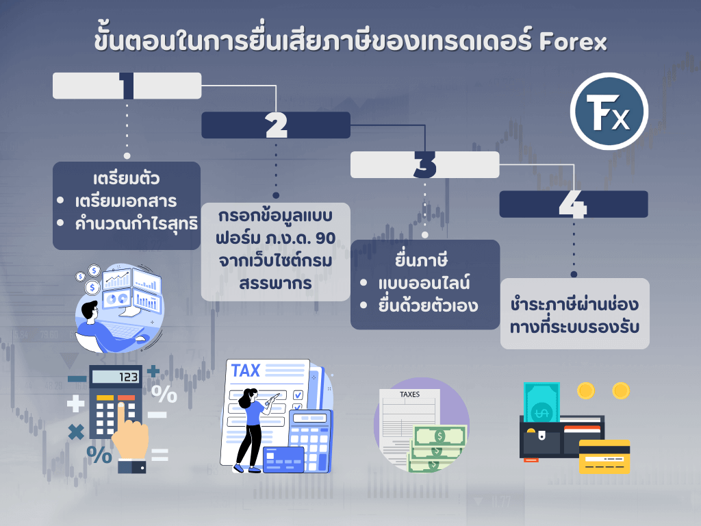 “กำไรจาก Forex จัดเป็น เงินได้พึงประเมินประเภทที่ 4 (ได้แก่ ดอกเบี้ย เงินปันผล เงินส่วนแบ่งกำไร เงินลดทุน/เพิ่มทุน) ซึ่งต้องยื่นแบบแสดงรายการภาษี ภ.ง.ด. 90 ภายในเดือนมีนาคมของทุกปี” – กรมสรรพากร