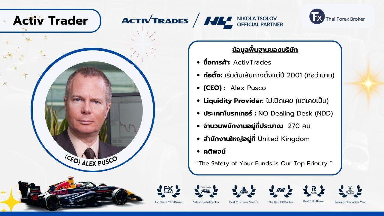 - ผู้บริหารหลักของ ActivTrades คือ Alex Pusco ซึ่งเป็นผู้ก่อตั้งบริษัทและมีบทบาทสำคัญในการพัฒนาโบรกเกอร์แห่งนี้มาตั้งแต่เริ่มต้นเลยครับ