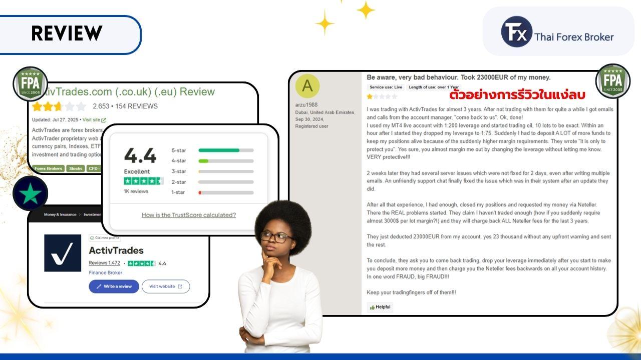 - ถ้าเป็นเว็บไซต์รีวิวโบรกเกอร์ที่สายเทรดรู้จักกันดีอย่าง Forex Peace Army (FPA) คะแนนของ ActivTrades จะออกมาแตกต่างจาก Trustpilot อยู่พอสมควรครับ