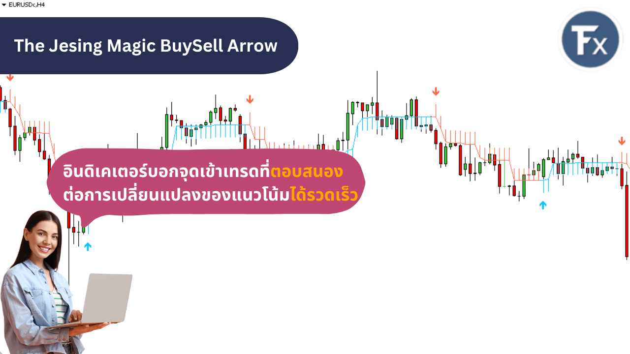 - The Jesing Magic BuySell Arrow สามารถใช้ตัวเดียวในการเทรดได้แต่ต้องใช้กับไทม์เฟรมใหญ่เท่านั้น เพื่อลดการเจอสัญญาณหลอกในช่วงที่ตลาดมีแนวโน้ม Side Way