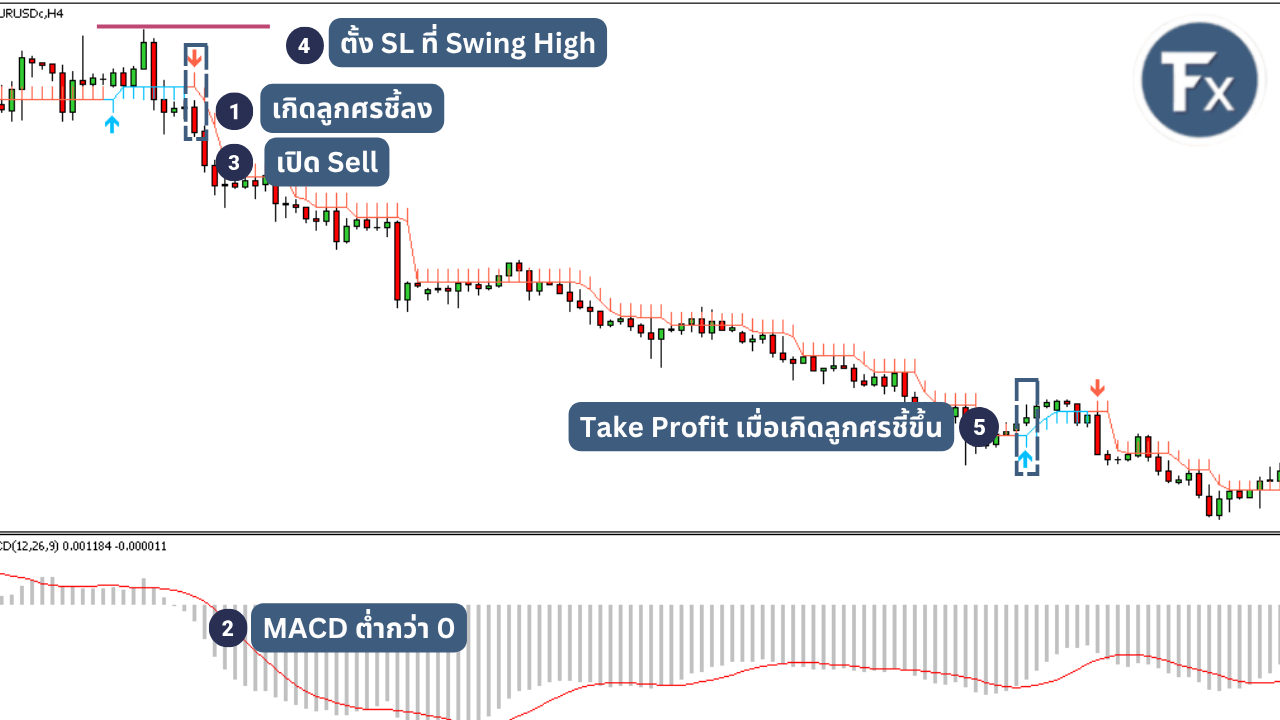 - ถ้าเกิดลูกศรชี้ลง และเกิดเส้นสีแดงแสดงว่าตลาดเริ่มเปลี่ยนเป็นแนวโน้มขาลง ให้เข้าเทรด Sell