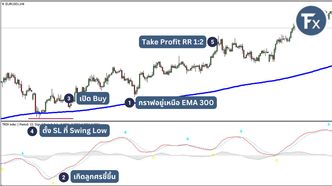 - เมื่อเส้น Trix ตัดกับเส้น Signal ขึ้น ใต้เส้น 0 เป็นสัญญาณเข้าเทรด Buy