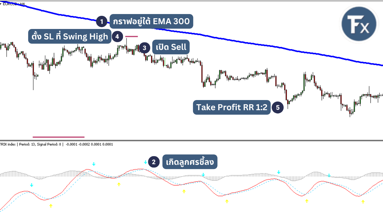 - เมื่อเส้น Trix ตัดกับเส้น Signal ลง เหนือเส้น 0 เป็นสัญญาณเข้าเทรด Sell