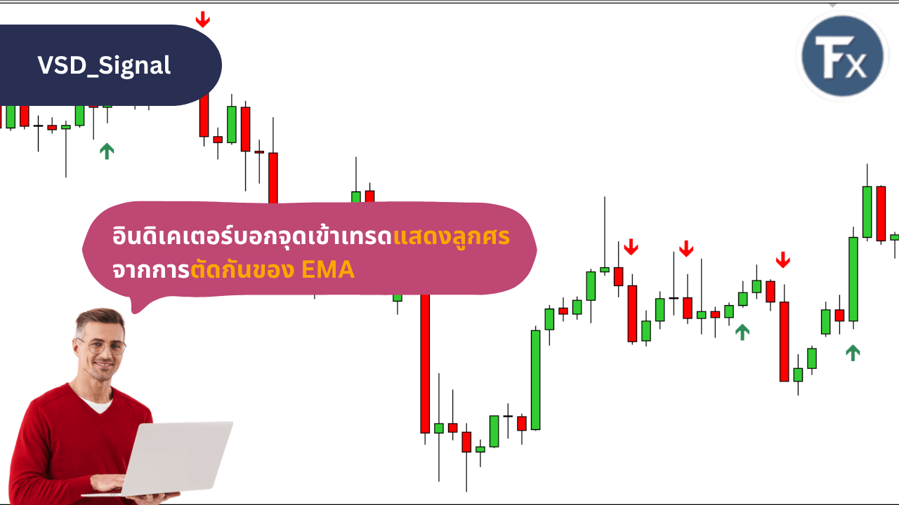 อินดิเคเตอร์บอกจุดเข้าเทรดในลักษณะของเทรนด์ โดยการแสดงสัญลักษณ์ลูกศรเกิดจากการตัดกันของเส้น EMA 2 เส้น ในรูปแบบของ Golden Cross และ Death Cross