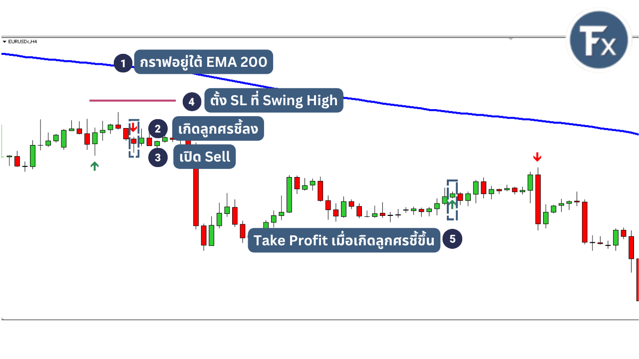 - เมื่อ EMA ตัดลงจะเกิดลูกศรชี้ลง แสดงให้เห็นว่าตลาดกำลังเป็นขาลง เป็นจุดเข้าเทรดหน้า Sell