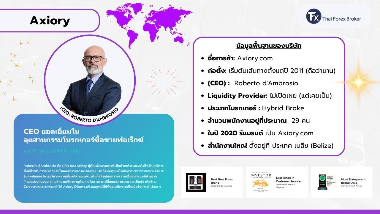 • ผู้บริหารหลักของบริษัทในปัจจุบันคือ Roberto d’Ambrosio ครับ ซึ่งดำรงตำแหน่ง CEO ของ Axiory Global และถือว่าเป็นบุคคลที่มีประสบการณ์ในวงการการเงินค่อนข้างสูงอีกคนหนึ่งครับ
