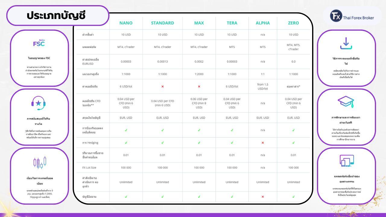 4. มีประเภทบัญชีให้เลือกหลายแบบ โบรกมีบัญชีหลายประเภท เช่น Nano, Standard, Zero, Max และ Alpha