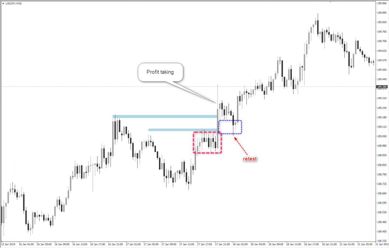 เมื่อมีการ breakout ราคาค่อนข้างจะวิ่งแรงและเร็วจะเกิด retest ประจำ เป็นโอกาสครั้งที่สองที่เปิดโอกาสให้เทรดเดอร์ท่านเข้าใจตลาดทำงานอย่างไร ได้มีโอกาสเทรดไปกับขาใหญ่ ก่อนเกิด breaokut ราคาก็จะวิ่งอยู่ในกรอบราคา ใหญ่-เล็กแล้วแต่ timeframes ถ้าเป็น timeframe ใหญ่จะเห็นอาการ breakout แรง เพราะเป็นเรื่องออเดอร์ที่สะสมที่เปิดเพิ่มขึ้นเรื่อยๆ ช่วงเวลาผ่านมาก่อนเปิด ก่อนอื่นต้องทำความเข้าใจโครงสร้างก่อน