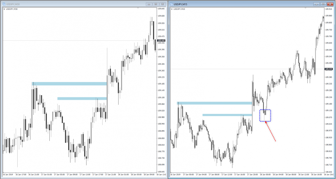 พื้นที่ retest ในการเข้าเทรดก็อ้างอิงจากพื้นที่ราคาเบรกขึ้นไป อย่างกรอบสีน้ำเงิน เวลาเทรดก็ลงไป timeframe ที่เล็กกว่าเพื่อหา price action ประกอบ เช่น engulfing bar, pin bar เป็นต้น ก็เปิดเทรด