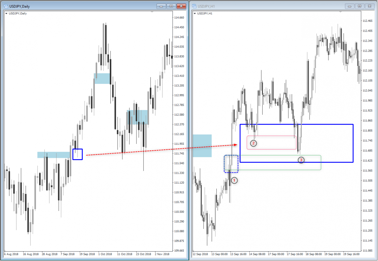 ภาพสุดท้าย พอเห็น breakout ในชาร์ต D1 เปิดมา ชาร์ต H1 เห็นจุดอ้างอิงที่ชัดเจนราคามา retest รอบแรก เลข 2 ก็เปิดโอกาสให้เทรดสะสมได้หลัง pin bar พื้นที่เหนือเลข 2 ราคาขึ้นไป ลงมาอีกต่ำกว่าเลข 2 เป็นการล่า stop ก่อน ลงมาถึงอีกจุดที่สนใจแล้วราคาก็เปิดเผย พอบาร์ล่าง stops ลงแล็วก็รีบกลับไปที่เดิมและพื้นที่เป็นจุด breakout บอกนัยว่าเป็นการเข้าเทรดหลังจากล่า stop ถ้าท่านมองดูโครงสร้างตรงนี้ที่ชาร์ต D1 ท่านจะไม่เห็นเปลี่ยนอะไรมาก เป็นแค่ราคามาเทรด เพื่อให้พวก trapped traders ออกจากตลาด จากตัวอย่างล่าสุดจะเห็นชัดว่า ยิ่ง breakout เกิดกับพื้นที่มาจาก timeframe ใหญ่ยิ่งมี trapped postions ที่อยู่เป็นส่วนประกอบ breakout ยิ่งเยอะ