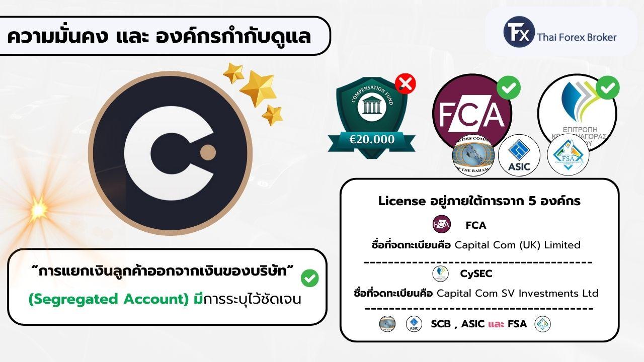 Capital.com ถือ License รวมทั้งหมด 5 หน่วยงาน ได้แก่ FCA, CySEC, ASIC, SCB และ FSA Seychelles ซึ่งถือว่าเยอะพอสมควรสำหรับโบรกเกอร์ CFD ครับ สำหรับนักเทรดชาวไทยโดยตรง จะอยู่ภายใต้การกำกับดูแลของ SCB ซึ่งเป็น License ที่ใช้รองรับลูกค้านอกยุโรปเป็นหลักนั่นเอง