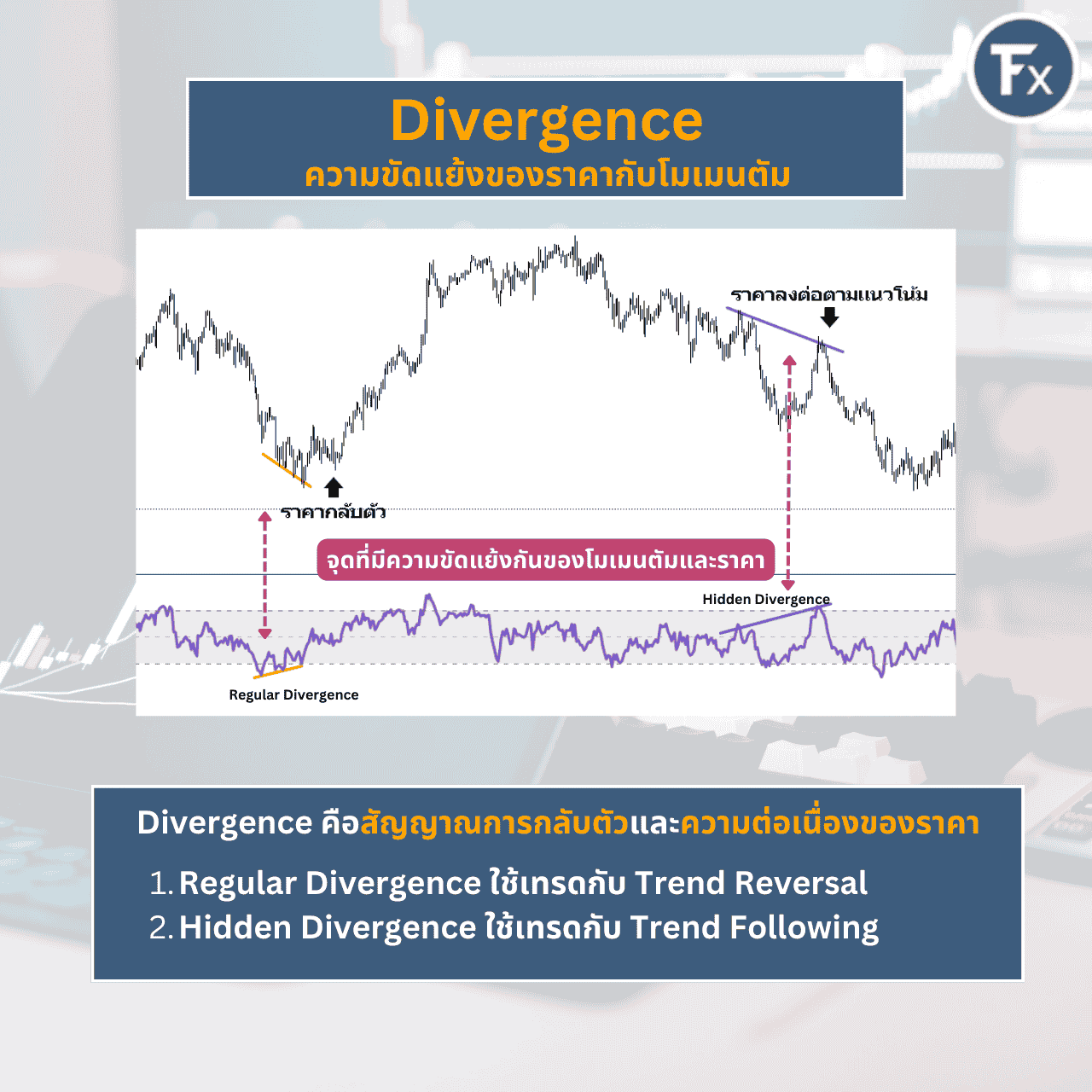 Divergence หมายถึง ความขัดแย้งกันของการเคลื่อนที่ระหว่างอินดิเคเตอร์แสดงโมเมนตัมและราคา ซึ่งนักเทรดส่วนใหญ่มักจะใช้เป็น “สัญญาณการกลับตัว” นอกจากนี้แล้วสัญญาณ Divergence สามารถใช้ดู “ความต่อเนื่องของเทรนด์” ได้อีกด้วย