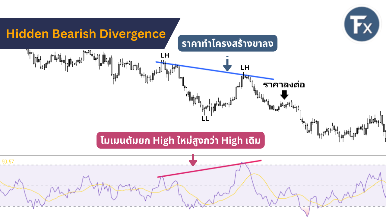 Hidden Bearish Divergence เป็นสัญญาณความต่อเนื่องโมเมนตัมของราคาในช่วงที่ตลาดเป็นขาลงโดยมีลักษณะของสัญญาณดังนี้