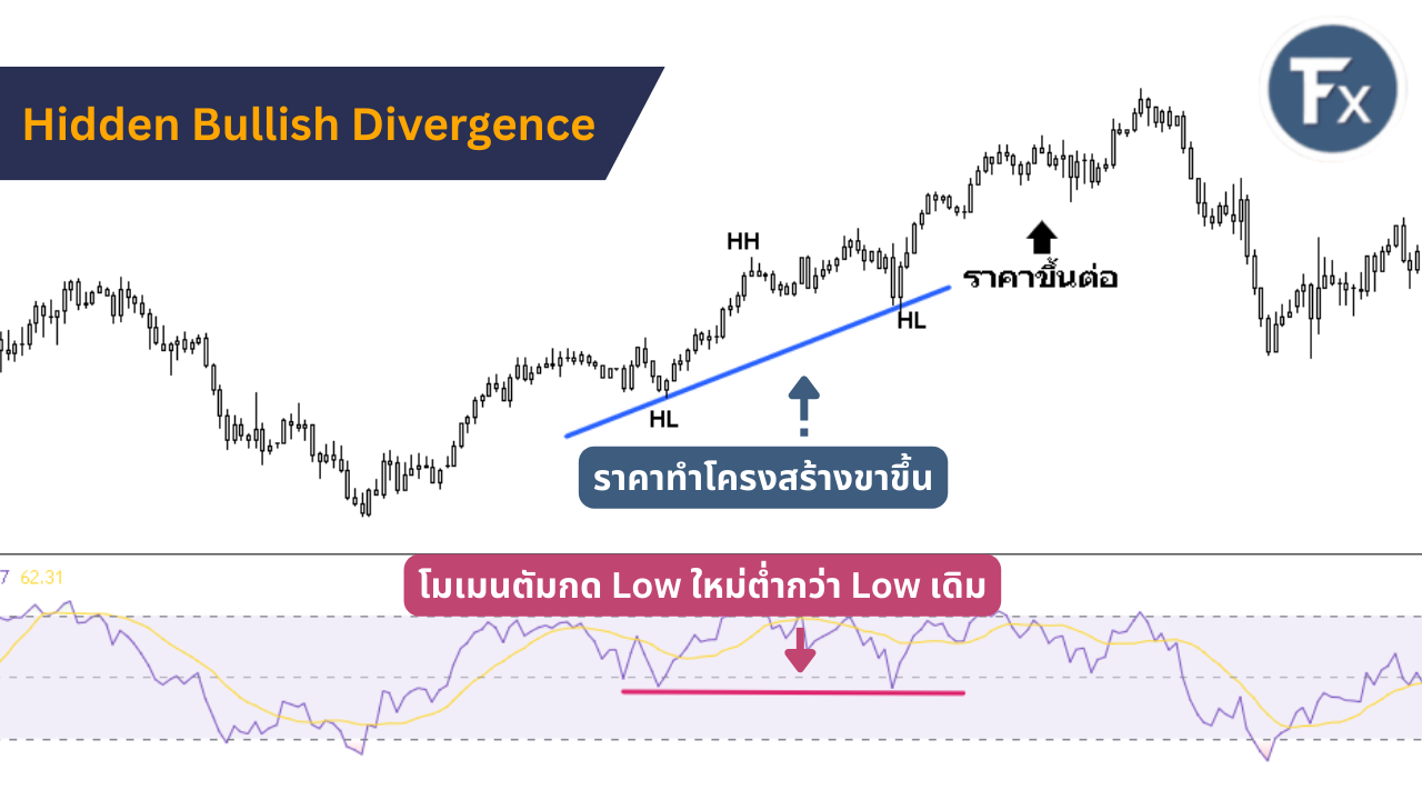 - Hidden Divergence แบ่งเป็น Hidden Bullish Divergence และ Hidden Bearish Divergence