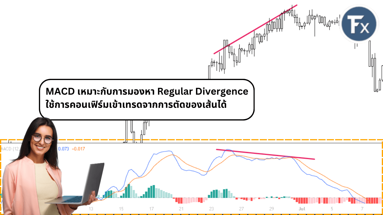 - MACD เป็นอินดิเคเตอร์ที่ใช้ดู Regular Divergence ได้แม่นยำอีกตัว ความพิเศษของตัวนี้คือเราสามารถใช้การตัดกันของ MACD ในการคอนเฟิร์มการเข้าเทรดได้