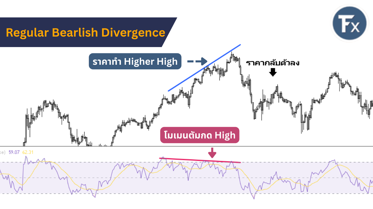 Regular Bearish Divergence เป็นสัญญาณการกลับตัวลงที่เกิดในช่วงตลาดขาขึ้นโดยมีลักษณะของสัญญาณ ดังนี้