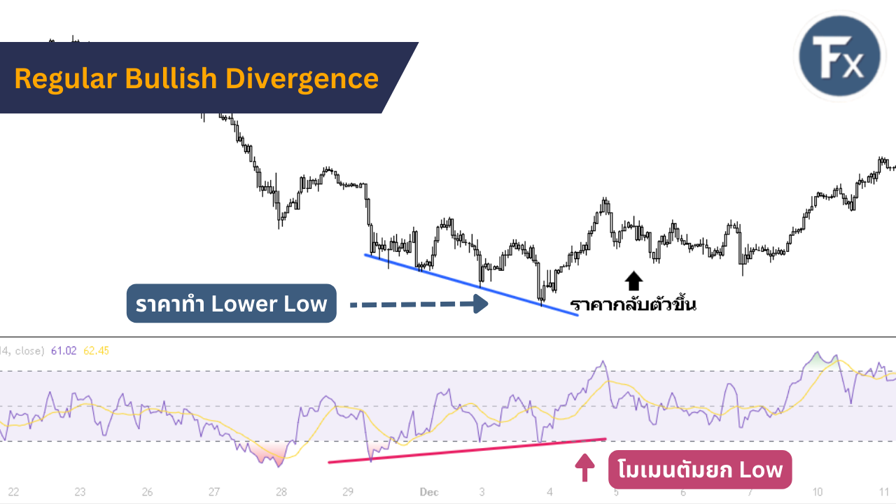 Regular Bullish Divergence เป็นสัญญาณการกลับตัวขึ้นที่เกิดในช่วงตลาดขาลงโดยมีลักษณะของสัญญาณ ดังนี้