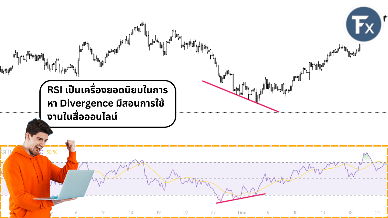 - RSI เป็นอินดิเคเตอร์ยอดนิยมที่ใช้ในการดู Divergence สามารถใช้ดูง่าย มีพื้นฐานและมีการสอนในโลกออนไลน์