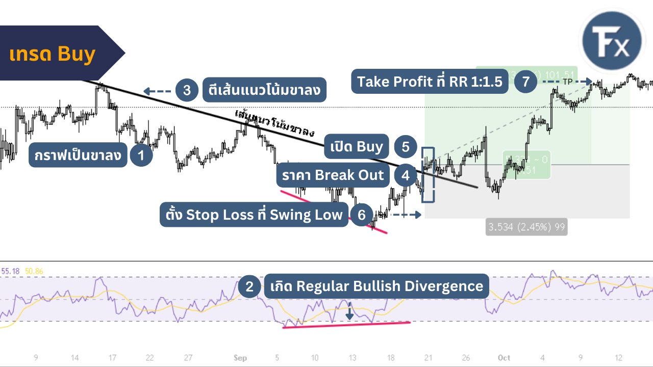 การเทรดรูปแบบ Trend Reversal โดยใช้ Divergence บวกกับเส้นแนวโน้มในการคอนเฟิร์มการกลับตัวของราคา การเทรดรูปแบบนี้จะเพิ่มความแม่นยำให้กับ Divergence มากขึ้น