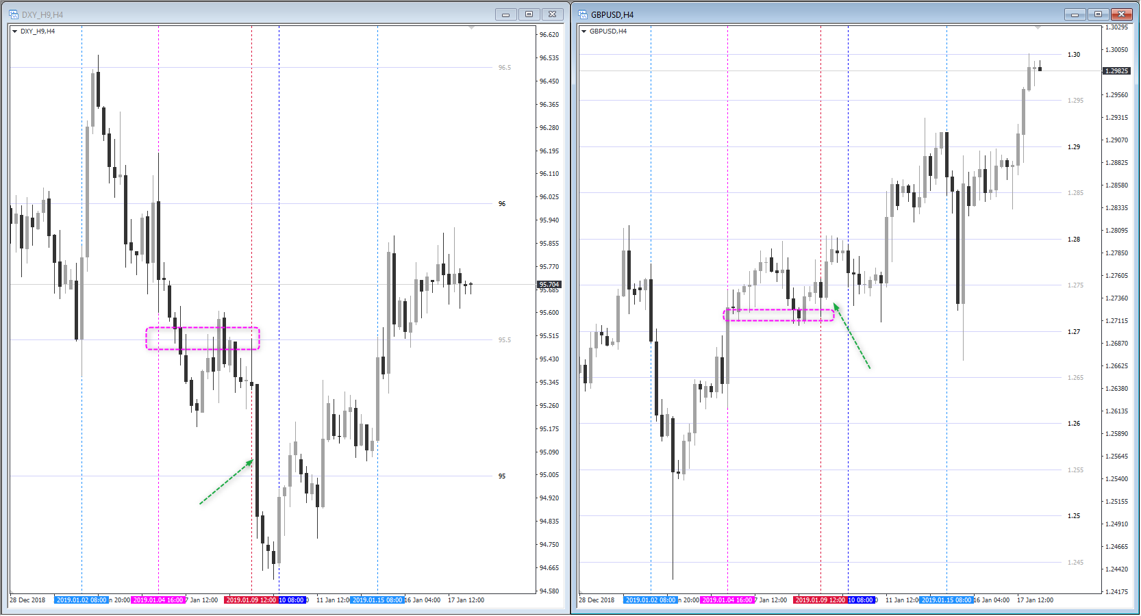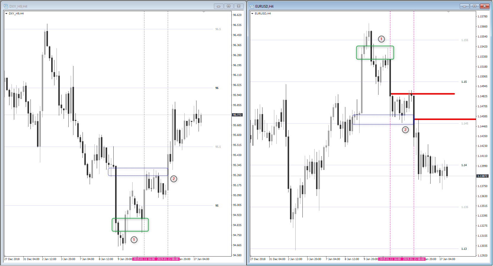 จะพบว่าเมื่อดูจาก price structure ของ Dollar Index และ EURUSD ยังเปิดโอกาสอยู่มีร่อยรอยการเปิดเทรดให้เห็นชัดเจนทั้ง 2 ชาร์ตสามารถใช้หลักการ correlation ตรง price levels ต่างชาร์ตมายืนยันเพื่อเพิ่มความเป็นไปได้ในการเทรด