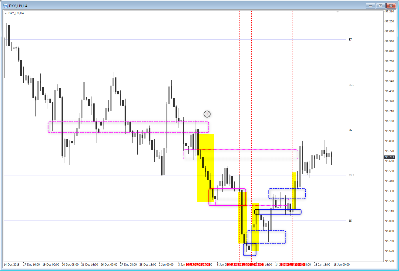 เริ่มต้นเปิด dollar index ดูว่าตรงไหนมีราคาวิ่งแรงๆ ที่ขาใหญ่เปิดเผยว่าเป็นการเข้าตลาด เราต้องการเห็นร่องรอย market orders ที่เข้ามาเยอะและต่อเนื่อง และสำคัญคือต้องมี price levels ตรงข้ามถูกเอาชนะ (engulfed)  มี trapped traders อยู่ในจุดนั้น ปิดชัดเจนเห็น new high/new low และ wick ต้องน้อยในทางที่ปิด