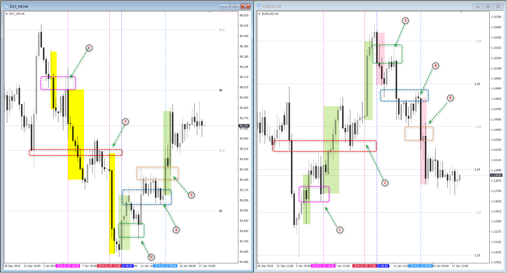 ที่เลข 1 dollar index เห็นว่าเป็นการเปิดเทรดเพิ่มที่จุดเดิมและลงเกิน low เดิมสามารถทำ new low ได้แสดงว่าเป็นร่องรอยที่เปิดเผยการเข้าเทรด placing trades จริง จุดแรกนี้ถ้าเปรียบเทียบจะเห็นราคา dollar ว่าร่อยรอย sell ลงชัดเจน แล้วราคากลับมาที่เลข 1 เปิดโอกาสให้ท่านเทรด eurusd ได้เพราะ price structure แบบเดียวกันแค่คนละทาง เกิดขึ้นในเวลาพร้อมกัน และใช้ชาร์ตหนึ่งยืนยันอีกชาร์ตหนึ่งสำหรับการเข้าเทรด นี้เรียกว่า correlate ตรง price level สำหรับเทรด
