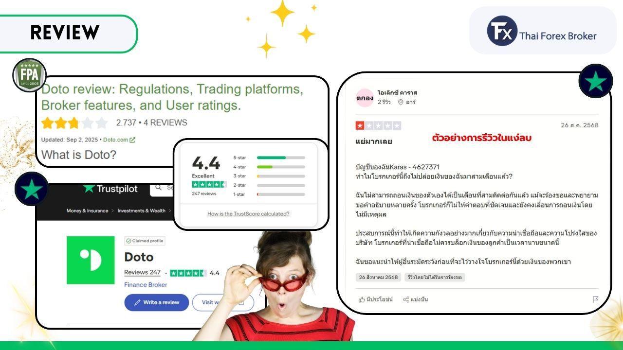 - คะแนนรีวิวของ Doto บน Trustpilot อยู่ที่ 4.4 จากผู้รีวิวประมาณ 247 คนครับ ต้องบอกว่าตัวเลขนี้ “ดูดีเลย” ในสายตาคนที่กำลังหาข้อมูลครับ