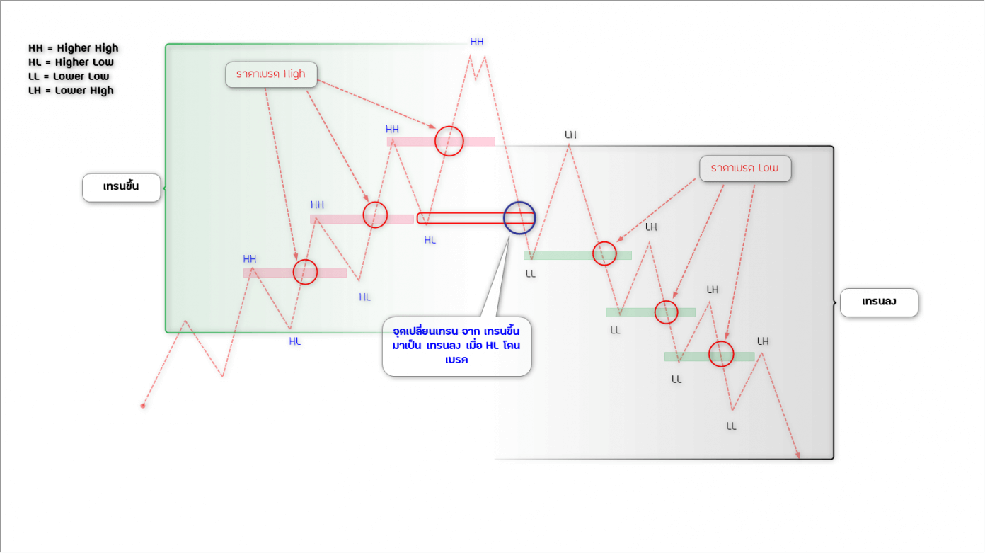 ถ้าราคายังคงทำไปแบบนี้ถือว่าราคากำลังทำเทรนลง เมื่อไรก็ตามการพัฒนาเรื่อง swing high/swing low เปลี่ยนไปนั่นเป็นสัญญาณว่าเทรนจะเปลี่ยน อย่างภาพด้านบนจะเห็นว่าเมื่อราคาย่อตัวลงมาไม่สามารถเด้งกลับได้แต่เบรค Higher Low ได้ด้วย นี่เป็นข้อมูลแรกที่เกิดขึ้นเรื่องของเทรนว่าอาจเกิดการเปลี่ยนตามมา ก็ให้ดูว่าราคาสามารถทำ Lower High ตามได้หรือเปล่า