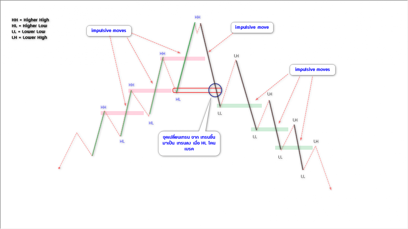 การที่ราคาสามารถทำ Higher High ได้ราคาย่อตัวลงมาและราคาสามารถเบรค High ขึ้นไปและสามารถทำ Higher High ใหม่ได้ การเคลื่อนไหวแบบนี้เรียกว่า impulsive move (ในทางกลับกันสำหรับเทรนลงราคาทำ Lower Low ได้ราคาย่อตัวกลับมาและราคาสามารถลงไปเบรค Low และทำ Lower Low ใหม่ได้เรียกกว่า impulsive move)