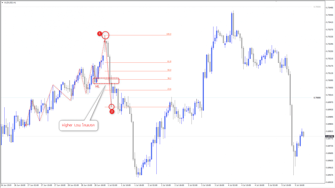 เมื่อท่านเห็น Impulsive move อย่างที่ภาพเพราะราคาลงอย่างแรงและมีการเอาชนะจะเห็น Higher Low โดนเบรคลงจากผลของการเข้าเทรดแรงๆ ที่เห็นเป็นรูป momentum bar เกิดขึ้น พอราคาลงไปต่ำสุด ราคาเริ่ม rejection ขึ้นก็ให้ท่านกำหนด Fibonacci Retracement จากจุดเลข 1 ไปยังจุดเลข 2 ท่านก็จะได้ Retracement สำหรับการย่อตัว impulsive move