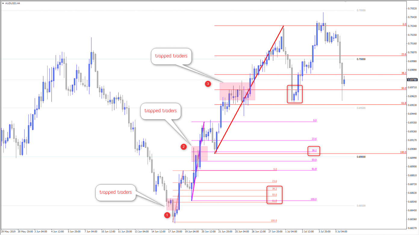 ประกอบที่ตัวเลขเช่น Pin Bar หรือ Engulfing Bar เกิดขึ้นมายืนยันก่อนค่อยเปิดเทรด เช่นอย่างตัวอย่าง Fibonacci Retracement ที่เลข 1 เป็น Pin Bar, ที่เลข 2 เห็น Engulfing Bar เข้ามายืนยันก่อนค่อยเปิดเทรด หรือใช้หลักการทำงานของออเดอร์และเข้าใจเทรดเดอร์อื่นๆ ทั้งที่อยู่ในตลาดและที่รอเข้า ด้วยการอ่านปริบทที่เกิดขึ้นกับแต่ละการเทรด Fibonacci Retracement จะเห็นว่าจุดที่ราคาย่อตัวมาและเห็น Retracement level ที่ราคาเด้งจะเป็นพื้นที่ราคาเอาชนะออเดอร์ตรงข้าม เลยทำให้เกิดมี trapped traders ตรงนั้น