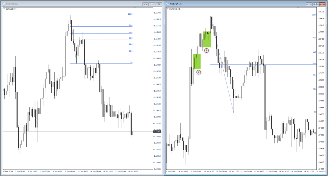 - เพราะราคาวิ่งมาผ่าน supply ที่ retracement levels 38.2 และ 50.0 แล้วค่อยมาที่ retracement level 61.8 ราคาต้อววิ่งผ่าน supply มา 2 supply ที่อยู่เหนือกันไม่ห่างมากเลยทำให้ level 61.8 โต้ตอบแรงเพราะ supply แรกที่ด้านล่างลดออเดอร์ไปให้เยอะ ก่อนจะมาถึง supply ที่ 2